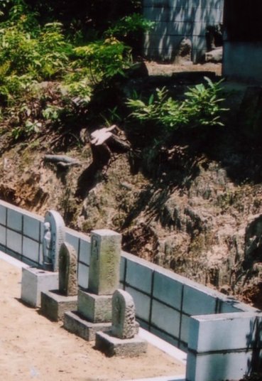 上からの土砂が墓地内に進入しないようにブロックで壁をしています。